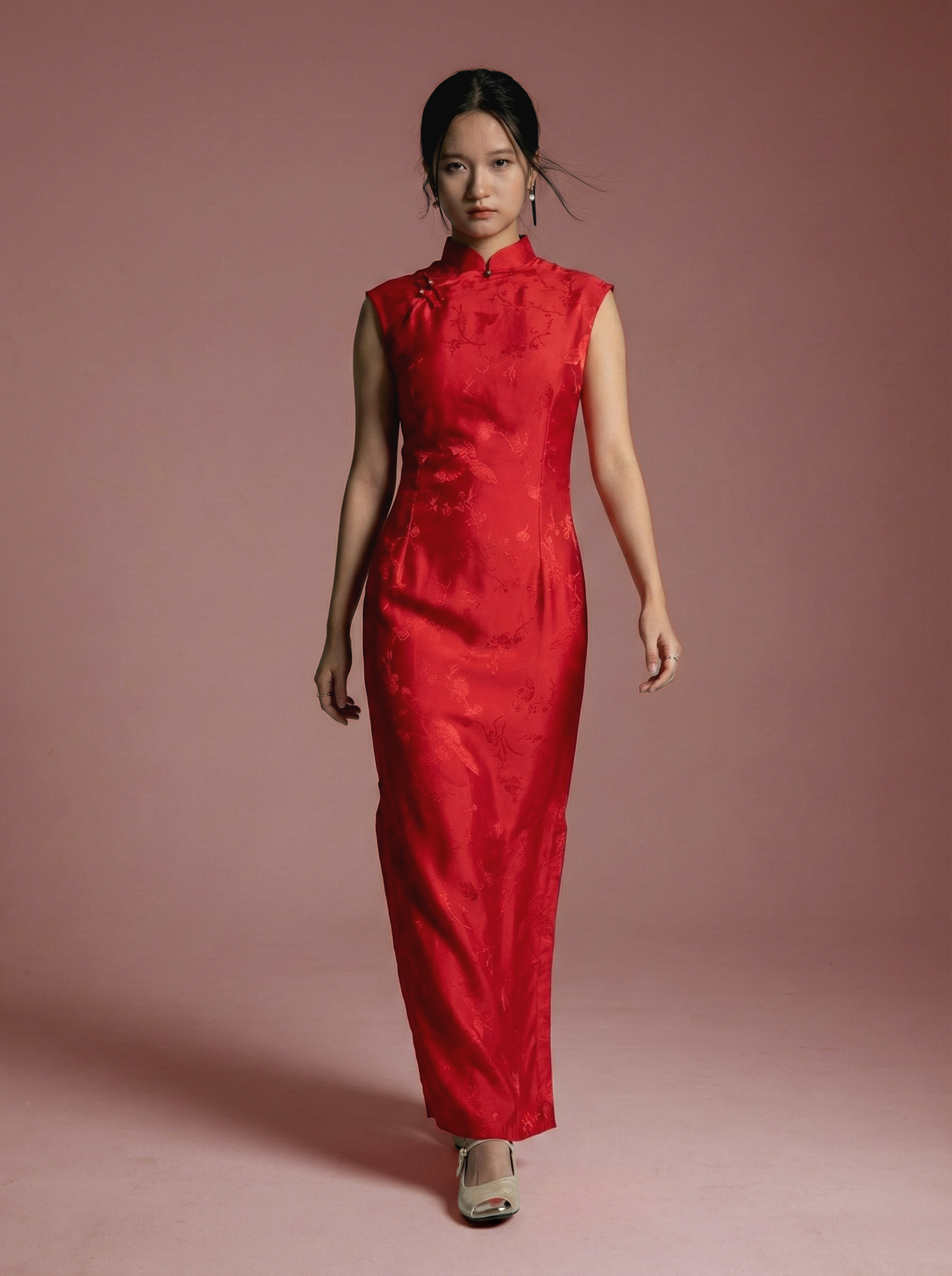 Uncompromising luxury with traditional frog closures and a subtle bird and blossom jacquard. See out the new year in bold crimson with our 100% mulberry silk qipao.